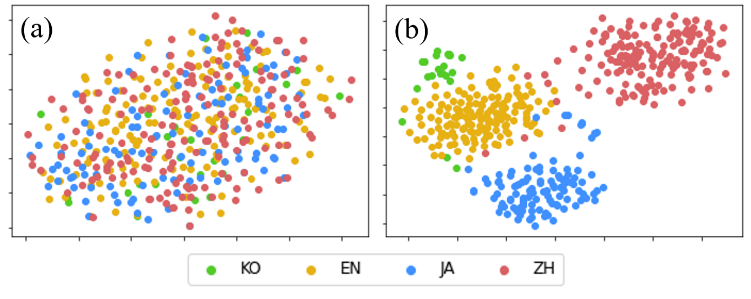 - Speaker regularization이 없는 경우, language 별 cluster가 형성됨