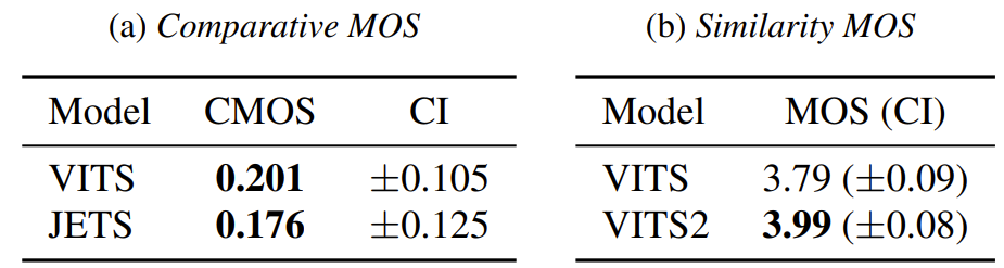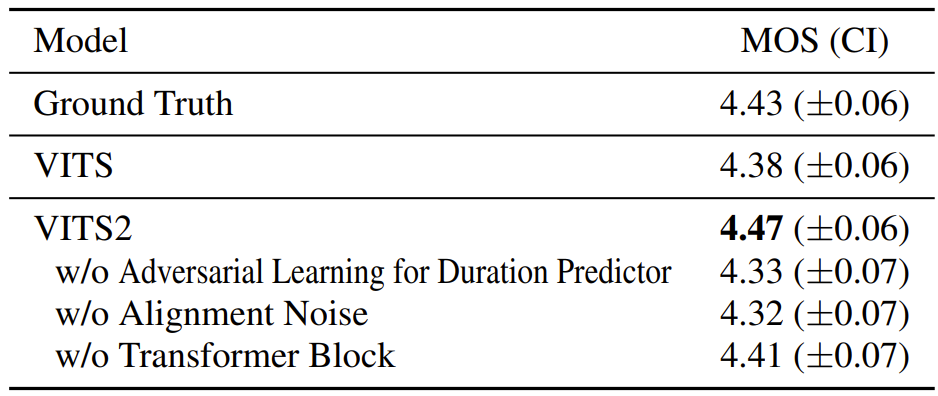 - 따라서 character error rate (CER) 측면에서 VITS와 VITS2를 비교해 보면, 제안된 VITS2가 더 뛰어난 성능을 보임