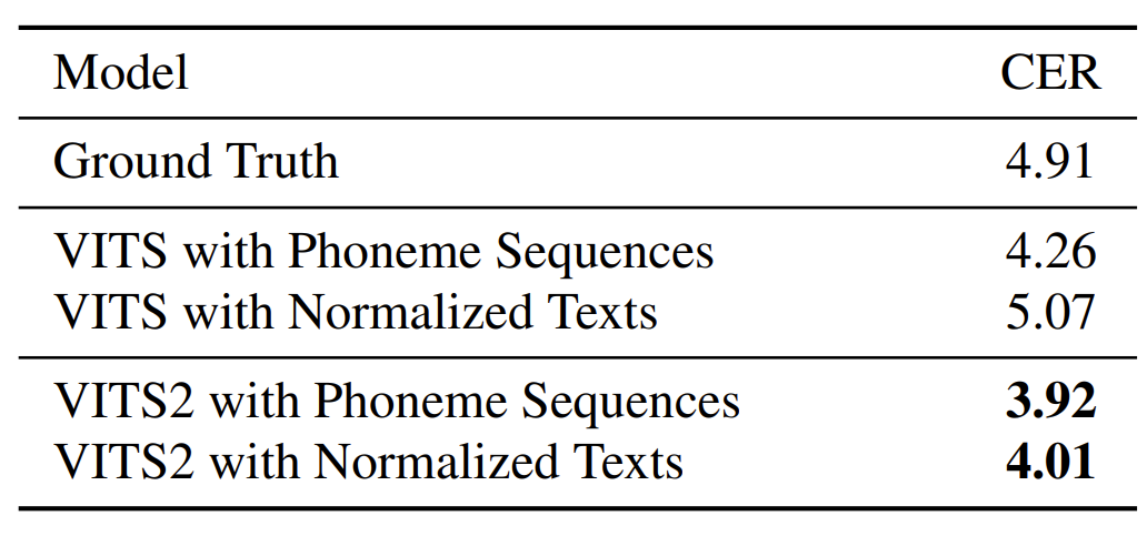 - 특히 normalized text를 사용하더라도 VITS2는 phoneme sequecne 수준의 CER를 달성할 수 있음