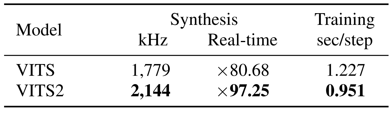 - 추가적으로 추론/학습 속도 측면에서도 VITS2는 기존대비 20.5%, 22.7%의 가속효과를 보임