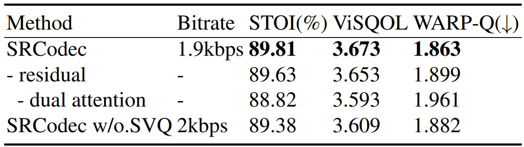 - Ablation study 측면에서 SRCodec의 각 component를 제거하는 경우 품질 저하가 발생함