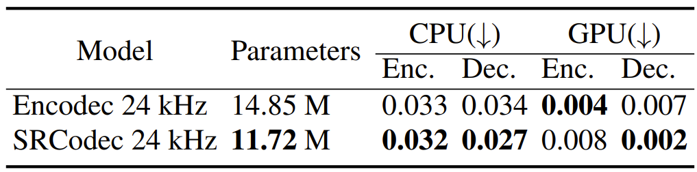 - Computation time 측면에서도 SRCodec은 EnCodec 보다 뛰어남