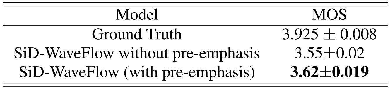 - Ablation study 측면에서, pre-emphasis를 사용하는 것이 MOS를 더 향상할 수 있는 것으로 나타남