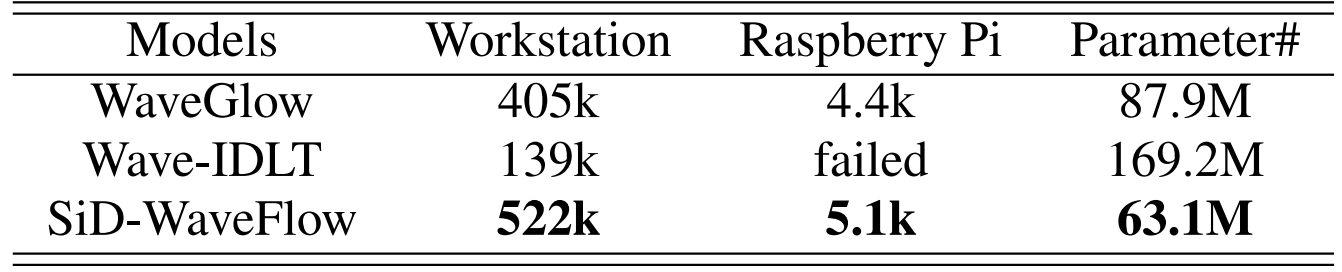 - 추론 측면에서도, SiD-WaveFlow는 workstation, Raspberry Pi 모두에서 적은 parameter로 동작 가능하면서 가장 빠른 속도를 달성함