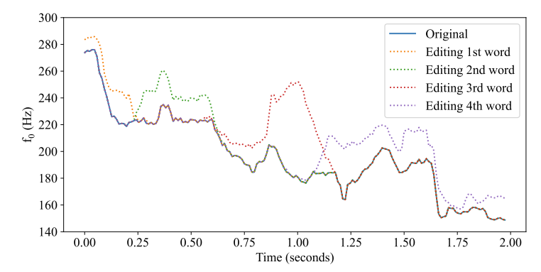 - Editing의 granularity를 확인해 보기 위해 문장의 각 단어별로 pitch-up shift를 적용해 보면, EdiTTS는 문장의 다른 부분의 변경 없이 target 단어의 pitch만 적절하게 증가시킬 수 있음