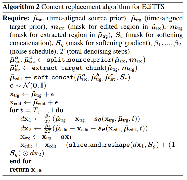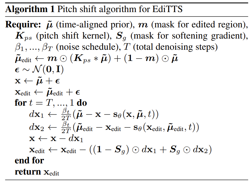 - EdiTTS는 먼저 아래 [Algorithm 1]을 따라, prior network에서 생성된 spectrogram-like latent $\tilde{\mu}$를 frequency axis를 따라 shift 함