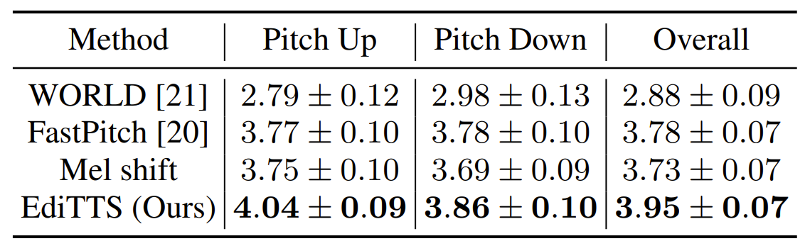 - Pitch shift 측면에서 EdiTTS는 FastPitch보다 뛰어난 성능을 보임