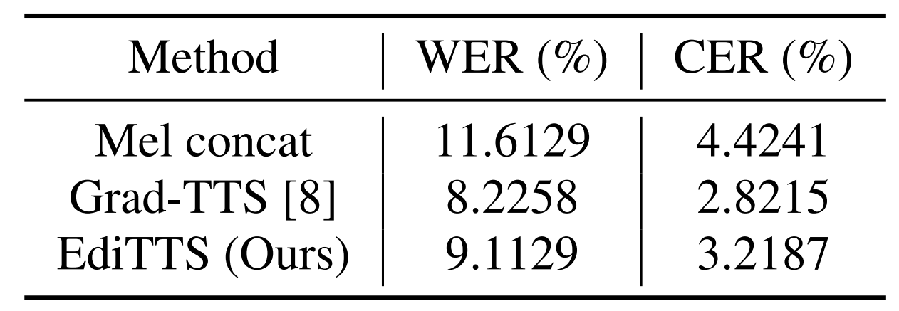 - Content edit 측면에서 EdiTTS는 Grad-TTS에 비해 훨씬 낮은 WER과 CER을 달성함