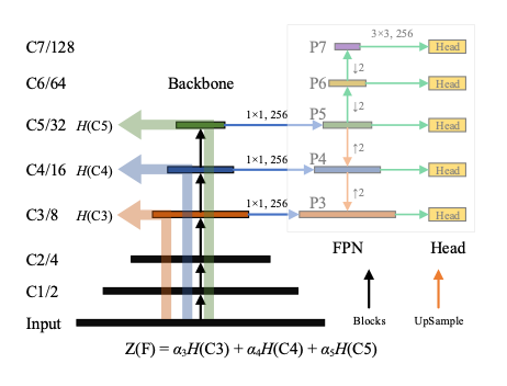 - $P3$, $P4$는 $P5$의 upsampling에 의해 생성, $P6$, $P7$은 $P5$의 downsampling에 의해 생성