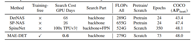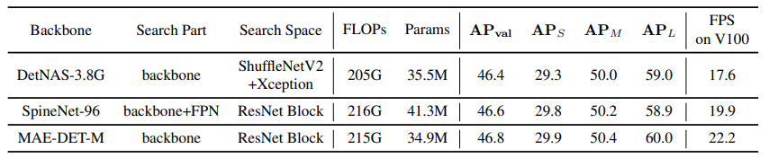 -> 다른 NAS 방법들과 비교했을 때 50~100배 빠른 검색 속도를 보임 - DetNAS, SpineNet에 비해 MAE-DET가 더 적은 parameter를 요구하고 V100에서 더 빠른 추론 속도를 보임