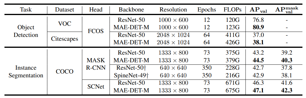 - VOC, Cityscapes : MAE-DET를 VOC, Cityscapes로 실험했을 때, ResNet 50과 비교하여 1.1%의 mAP 향상