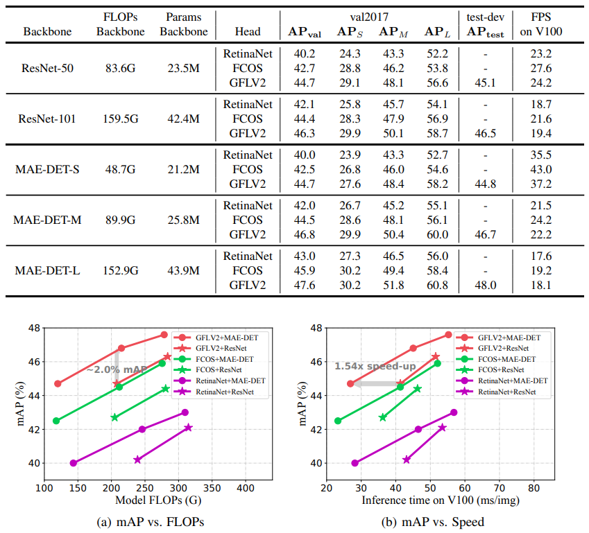 - MAE-DET-S는 ResNet-50 보다 60% 적은 FLOP 사용