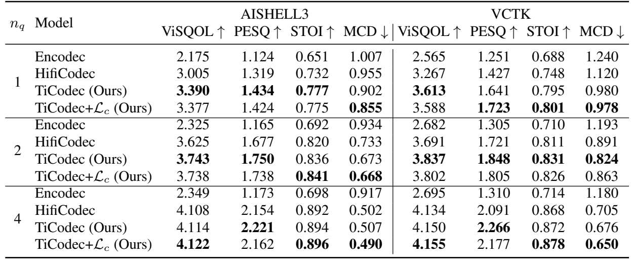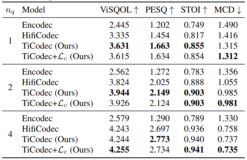 - Reconstruction 성능 측면에서 TiCodec이 가장 우수한 결과를 보임