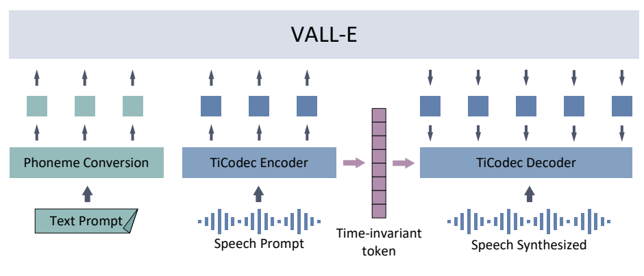 - Zero-Shot TTS를 위해 TiCodec은 prompt speech에서 time-invariant token을 직접 추출하여 VALL-E decoder에 반영할 수 있음