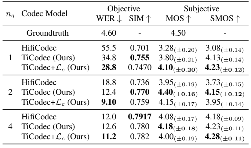 - 결과적으로 TTS 측면에서도 TiCodec을 사용했을 때 가장 좋은 성능을 달성함