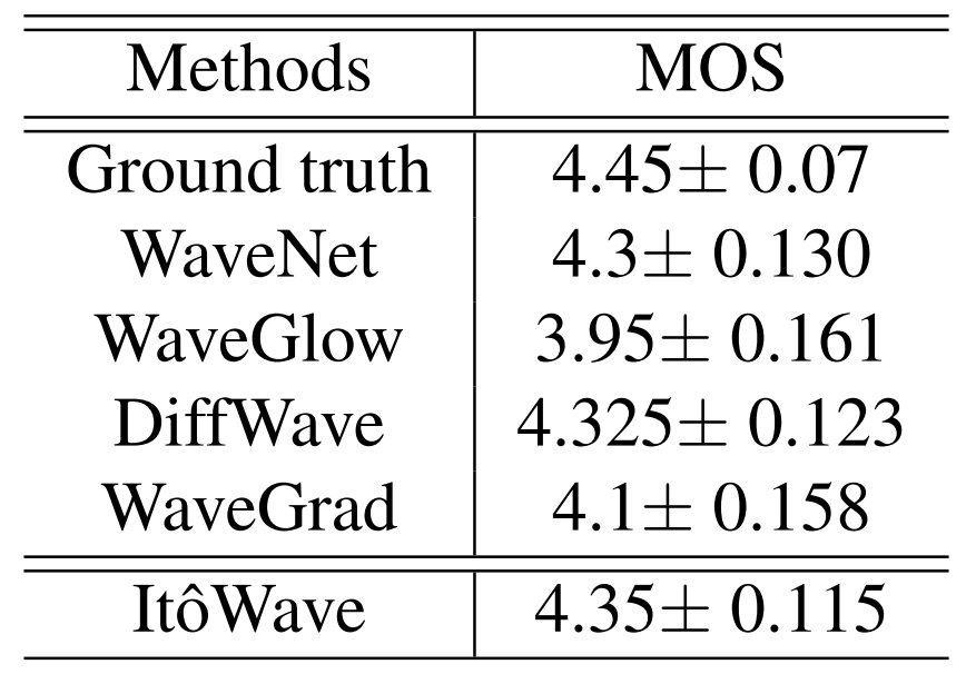- MOS 측면에서 ItoWave는 가장 뛰어난 성능을 달성함