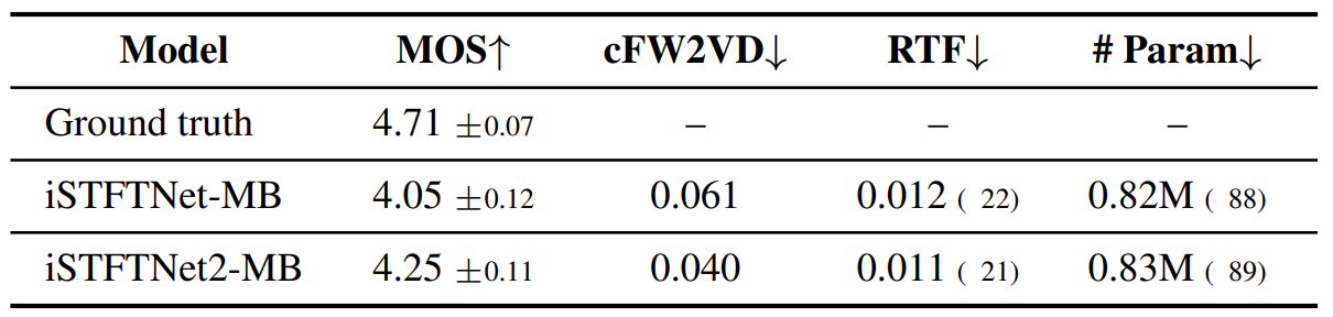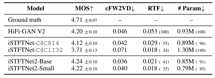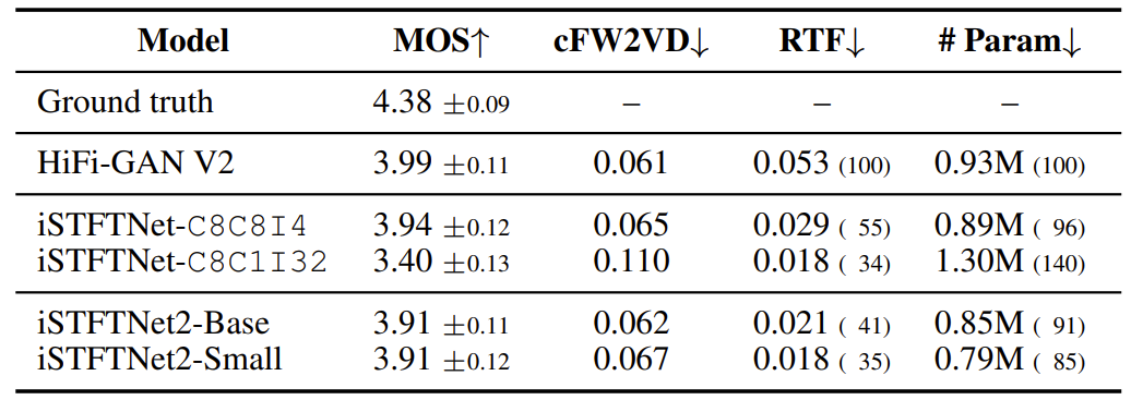 - RTF와 Parameter 수 측면에서도 iSTFTNet2는 가장 효율적인 것으로 나타남