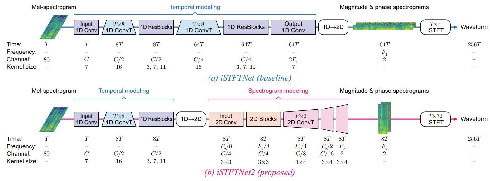 - Temporal, spectral structure를 각각 모델링하기 위해 1D-2D CNN을 활용해 iSTFTNet을 개선