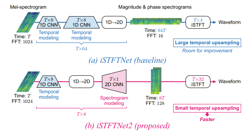- BUT, 1D CNN은 high-dimensional spectrogram을 모델링하기 어렵고, temporal upsampling에 대한 추가적인 속도 개선의 여지가 남아있음 - iSTFTNet2