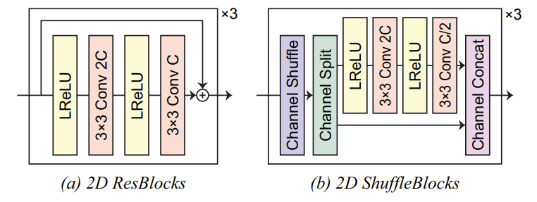 - 해당 channel shuffle, channel split, channel concatenation은 weight-free operation이므로 2D ResBlock 보다 빠르게 동작가능함