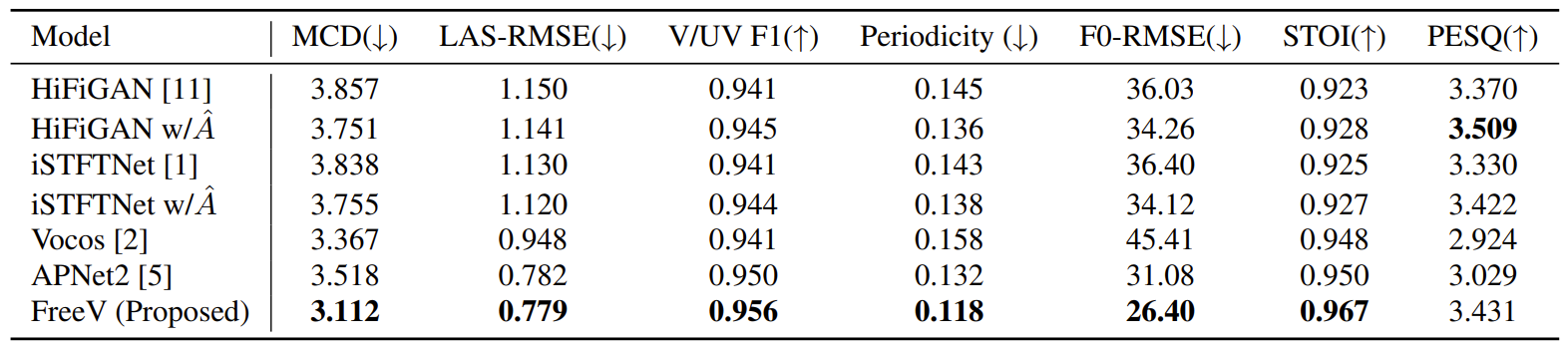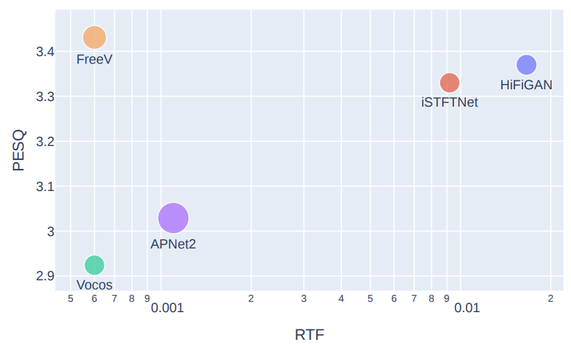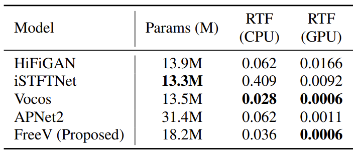 - 추론 속도 측면에서도 FreeV는 Vocos 수준의 빠른 합성 속도를 보임