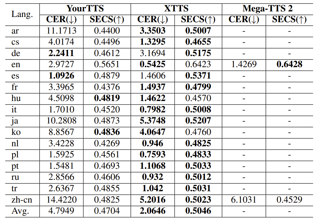 - YourTTS는 3가지, Mega-TTS2는 2가지 language만을 사용함