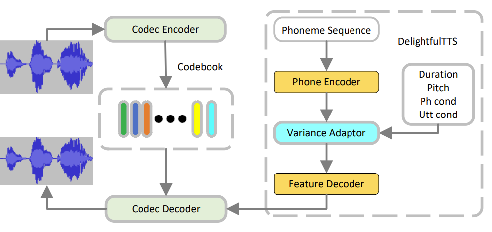- DelightfulTTS를 기반으로 phoneme sequence에서 encoded feature를 예측하고, 더 나은 음성 품질을 위해 acoustic model과 codec에 대한 joint training을 채택