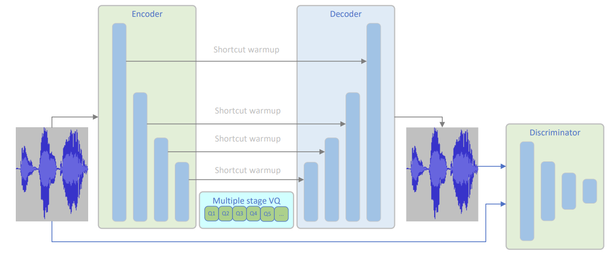 - 구조적으로 해당 codec network는 아래 그림과 같이 bottom/top layer 사이에 skip-connection이 있는 symmetric encoder-decoder network와 feature bottleneck인 multi-stage vector quantizer로 구성됨