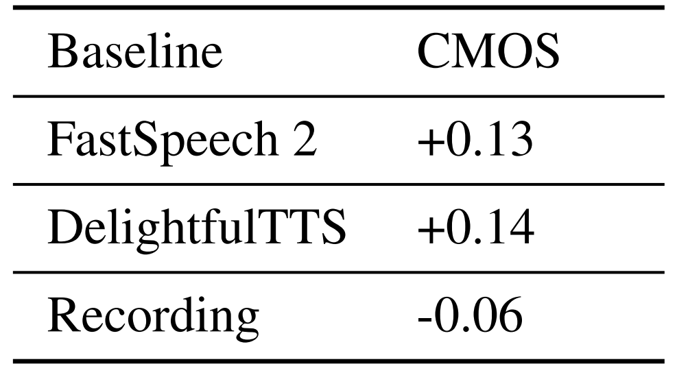 - CMOS 측면에서도 마찬가지로 DelightfulTTS2가 더 선호되는 것으로 나타남