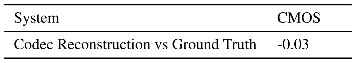 - Codec의 reconstruction 성능을 확인해 보면, -0.03 CMOS로 ground-truth와 큰 차이를 보이지 않음
