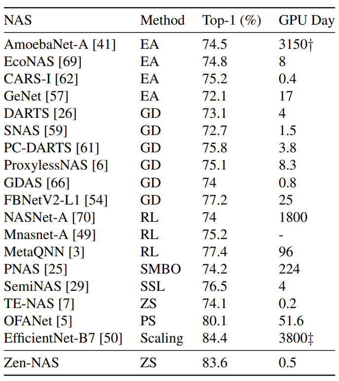 - Zen-NAS는 0.5 GPU day 만에 ImageNet에서 SOTA 성능을 달성
