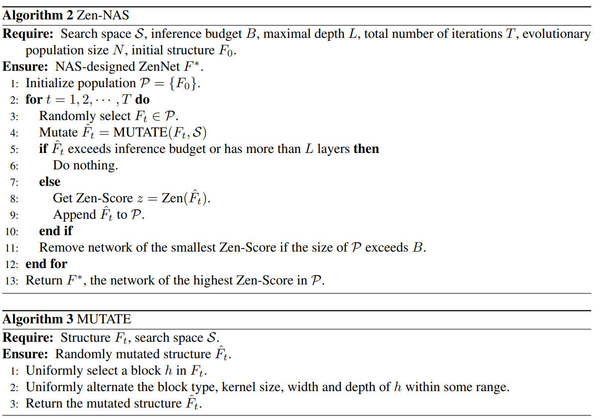- Zen-Score를 기반으로 주어진 추론 예산하에서 target network의 Zen-Score를 최대화하는 NAS 알고리즘