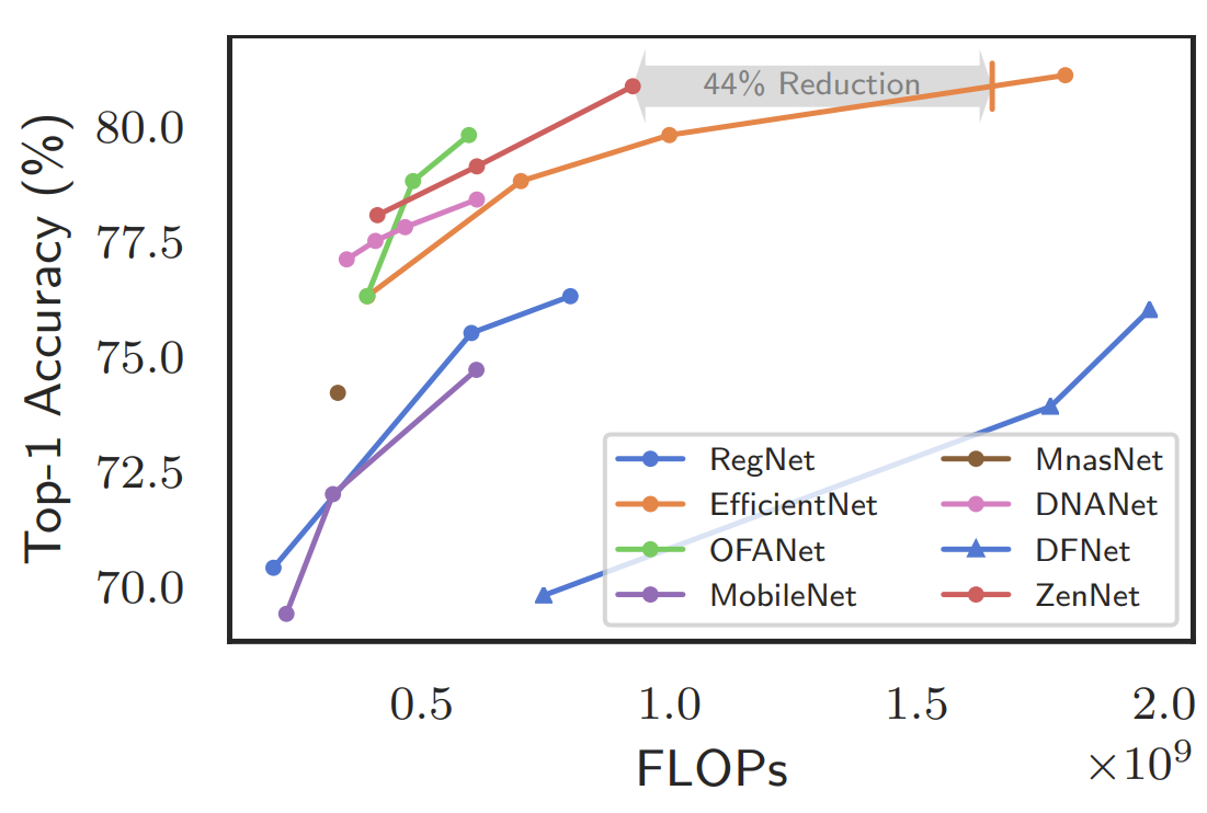 - ZenNet은 80.8%의 top-1 accuracy를 EfficientNet보다 43% 더 적은 FLOP만으로 달성