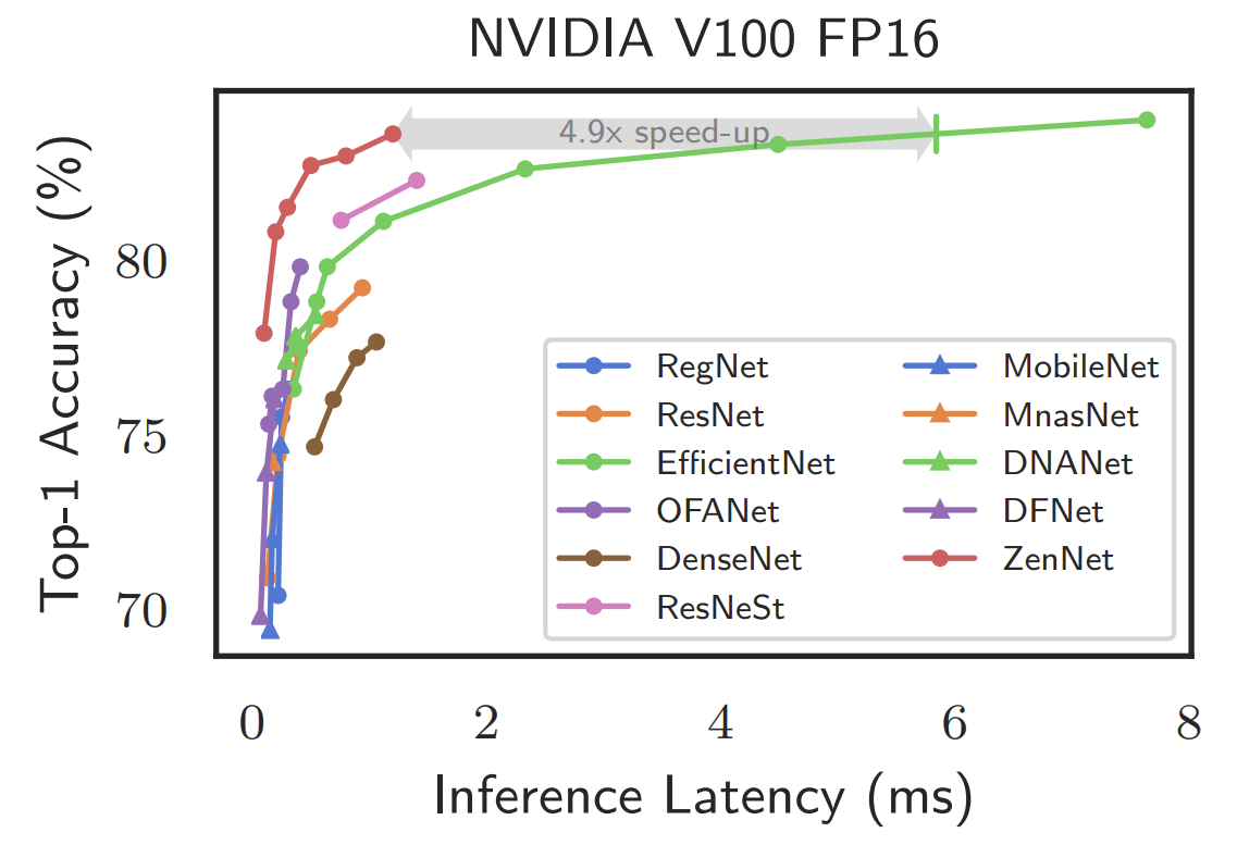 - ZenNet은 EfficientNet과 비교했을 때 83.6%의 top-1 accuracy를 4.9배 더 빠르게 달설