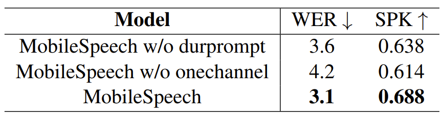 - 정량적, 정성적 지표 모두에서 MobileSpeech의 성능이 저하되는 것으로 나타남