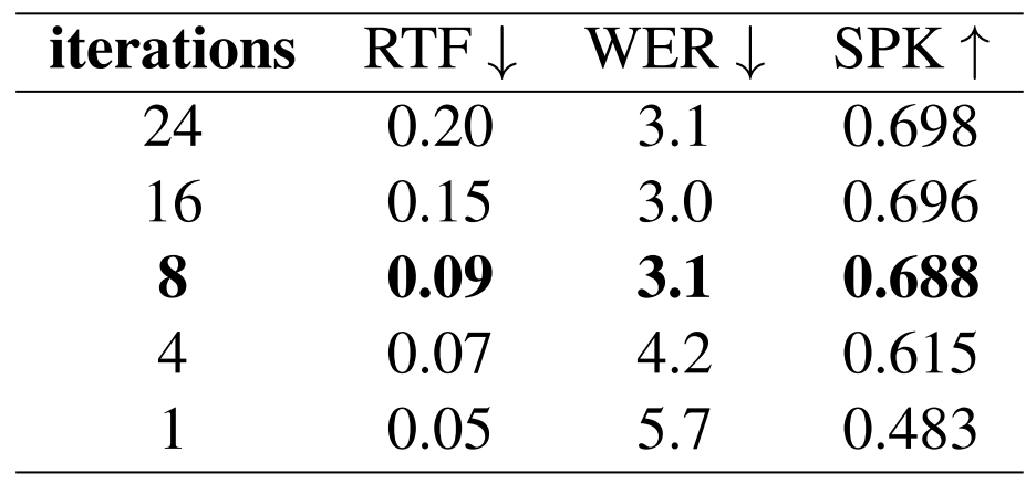 - 추가적으로 추론 속도 측면에서, iteration 수는 RTF와 반비례하는 것으로 나타남
