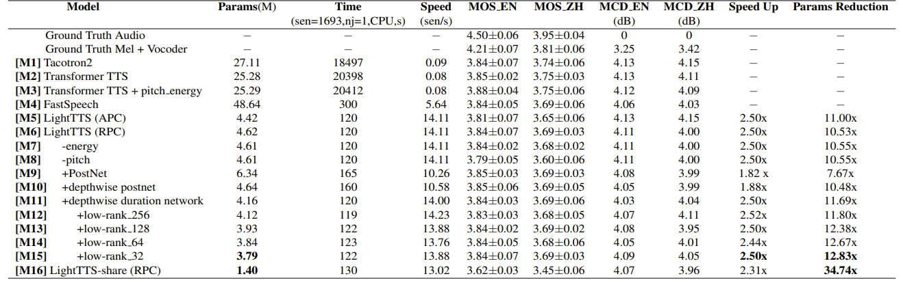 - Light-TTS는 최대 2.5배의 추론 속도 향상과 34.74배의 parameter 절감 효과를 보임