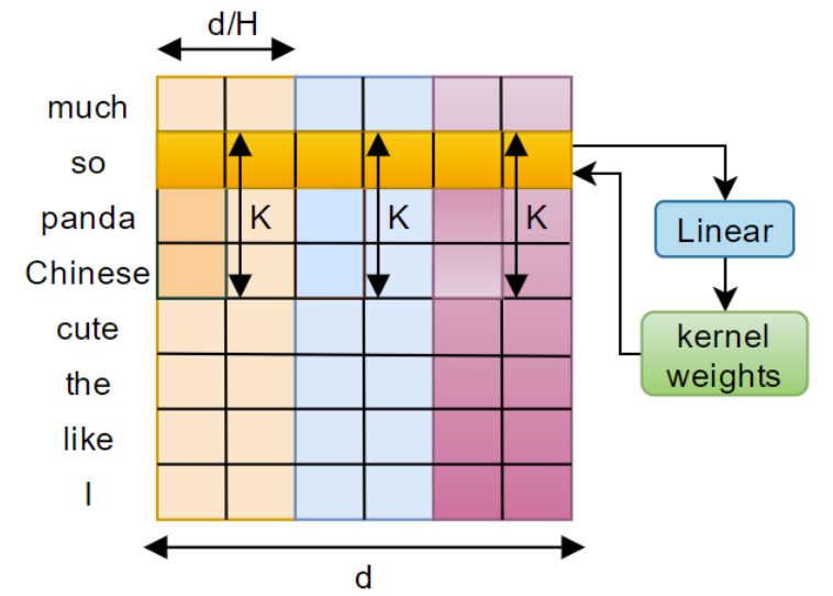 - 여기서 $K$를 lightweight convolution의 kernel size, $d$를 word embedding dimension, $H$를 group 수라고 하자