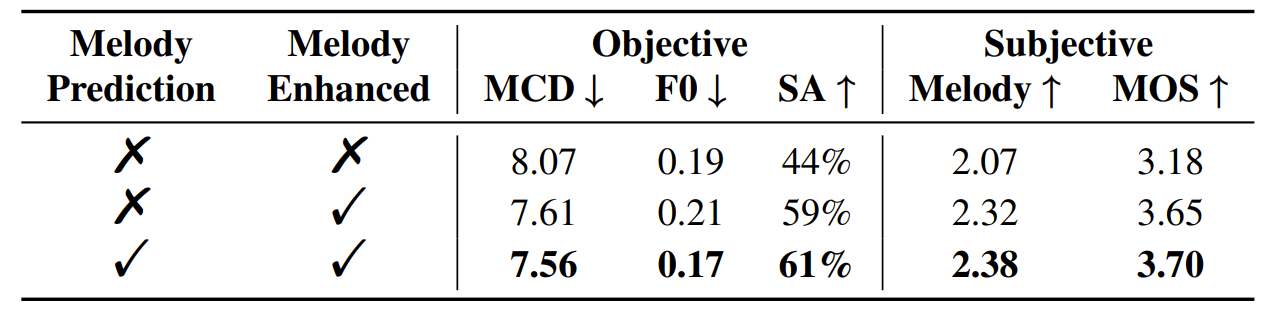 - Melody predictor, Melody enhancement를 모두 사용하는 경우 합성 성능을 크게 향상할 수 있음