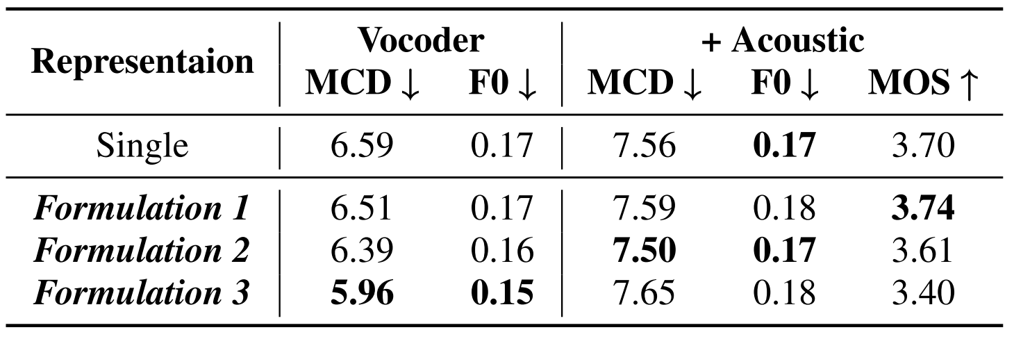 - 특히 Formulation 3의 residual clustering은 더 많은 detail을 encoding 하여 vocoder의 성능을 향상할 수 있음