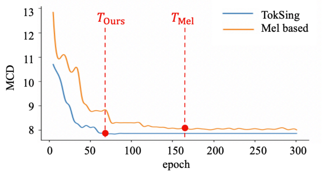 - 수렴 속도 측면에서도 TokSing은 mel-based model보다 빠르게 수렴함