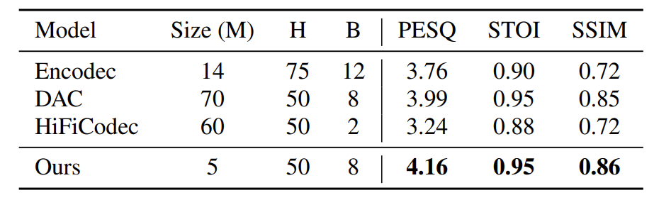 - 기존 codec 모델과 비교하여 논문의 SQ-Codec이 가장 우수한 성능을 보임