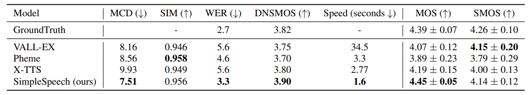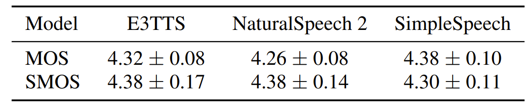 - 기존 TTS 모델과 비교하여 SimpleSpeech는 가장 우수한 성능을 달성함
