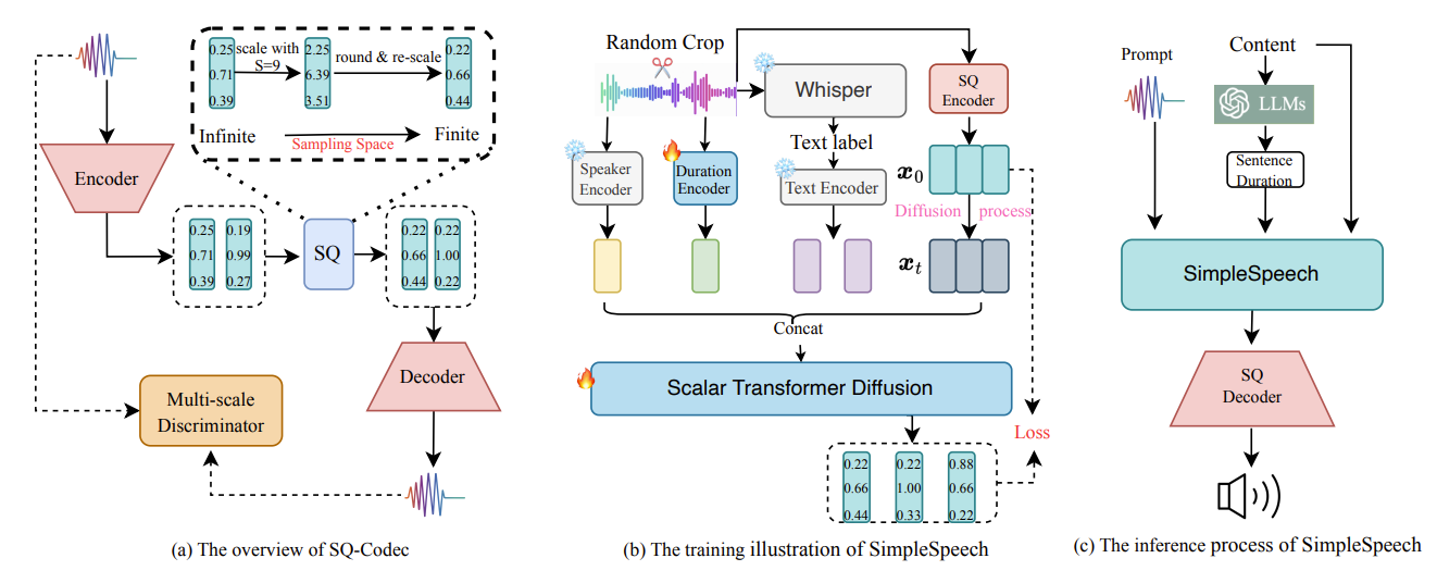 - SimpleSpeech는 크게 SQ-Codec과 Scalar Transformer Diffusion으로 구성됨