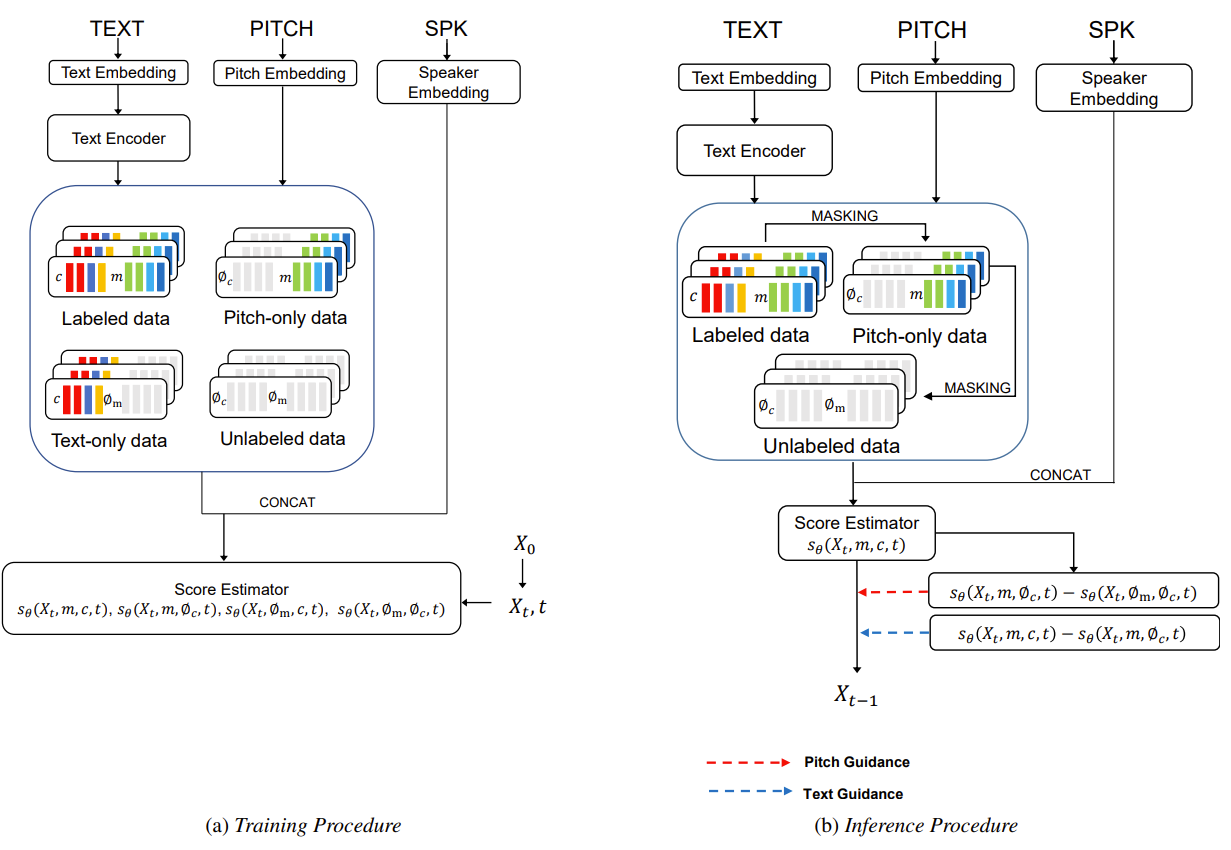 - 이를 통해 paired data가 제한된 low-resource scenario에서도 robust 하게 활용할 수 있음 - 추론 시에는 적절한 pitch/text guidance를 제공하기 위해 dual guiding mechanisim을 적용