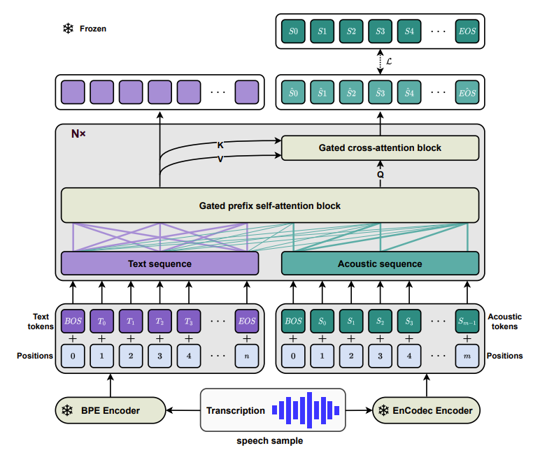 - 이때 target text sequence와 acoustic token을 condition으로 first residual quantizer에서 subsequent codeword를 예측하는 것을 목표로 함 - Transcribed text sequence를 $\mathcal{X}$, $\mathcal{A}_{:,1}$을 speech $\mathcal{S}$에서 추출된 first quantizer의 acoustic token이라고 하자