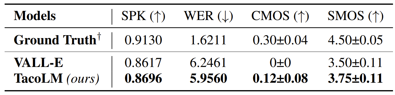 - Zero-shot TTS 성능 측면에서 TacoLM이 VALL-E 보다 뛰어난 성능을 달성함
