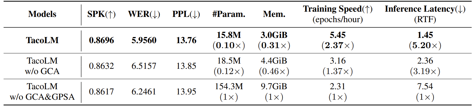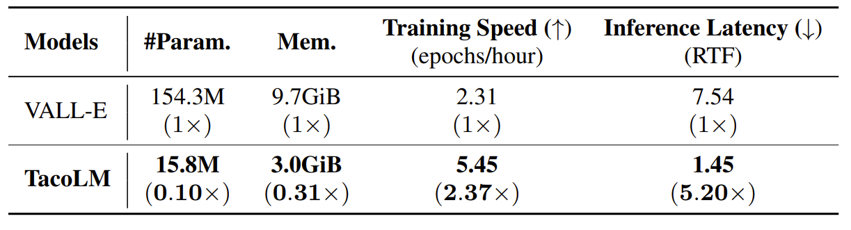 - Model size와 속도 측면에서도 TacoLM이 더 효율적임