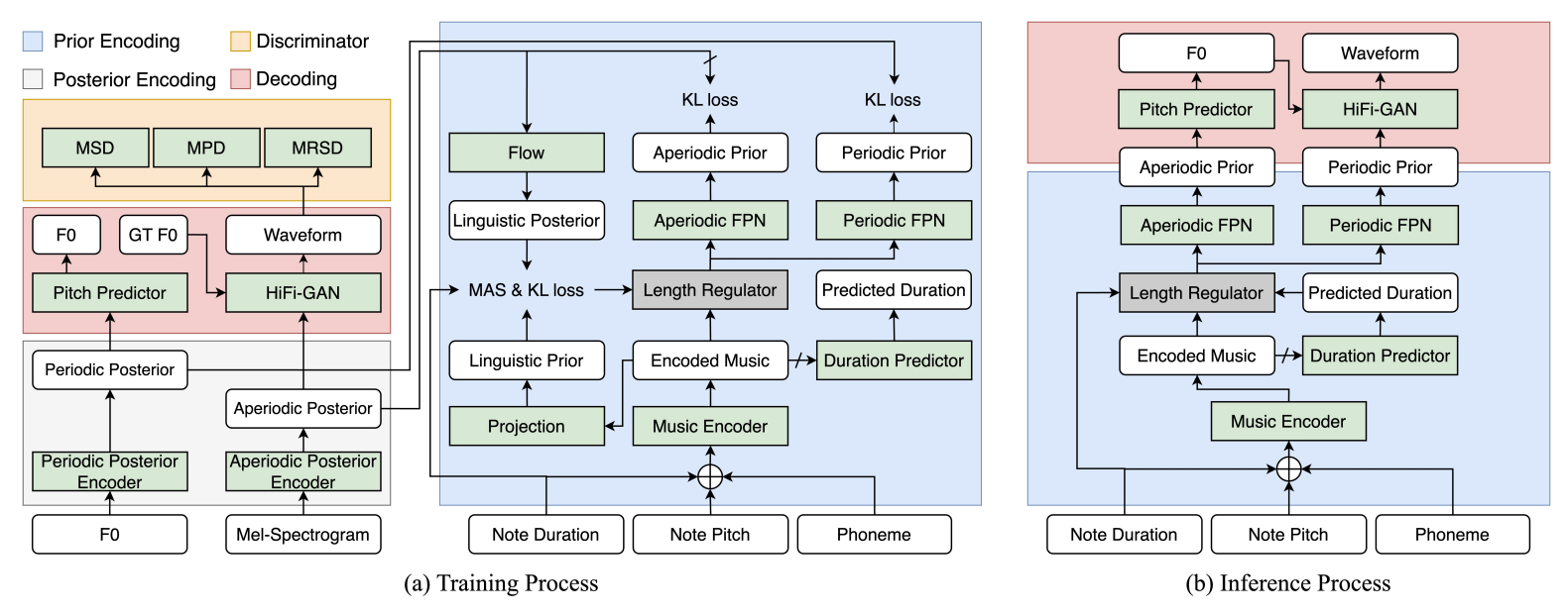 - 추론 시에는 length regulator로부터 얻어진 predicted phoneme duration $\hat{d}$를 사용 - Expanded encoded music representation $h$는 FPN에서 periodic/aperiodic frame에 대한 prior distribution을 추출하는데 사용됨