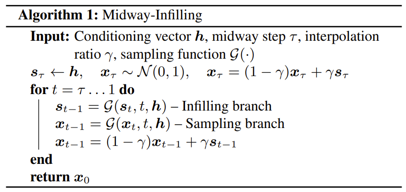 - Midway-Infilling은 unconditional diffusion model에서 sampling step을 condition 하는 것을 목표로 하는 infilling algorithm을 기반으로 함